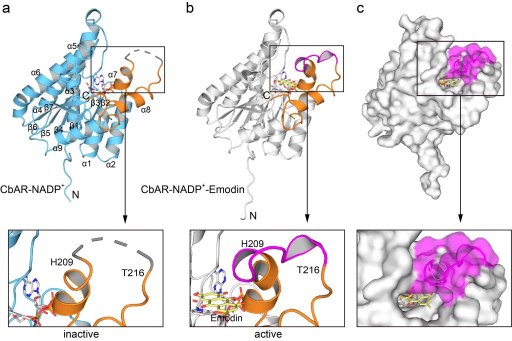 Figure 2.Overall crystal structure of CbAR in complex with NADP+or NADP+-Emodin.