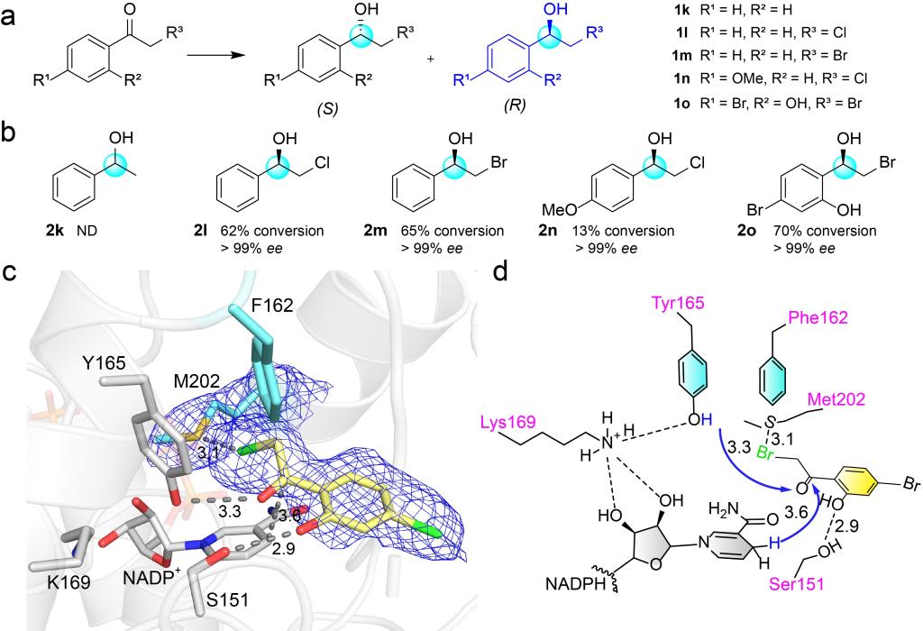 最后,作者进一步探索了H162F的底物谱。以1k和1l为研究对象,测试它们能否被转化为相应的手性醇(Fig. 5a),结果表明,两种底物都不能被CbAR转化为相应的产物,而1l可以被CbAR-H162F还原为β-卤代醇(2l),且具有良好的对映选择性(>99%ee)(Fig. 5b)。此外,H162F还可以催化1m、1l和1n生成相应的光学纯的产物图(Fig. 5b)。随后,作者通过H162F-1o复合物的晶体结构揭示了H162F催化这类底物的分子机制(Fig. 5c, d)。