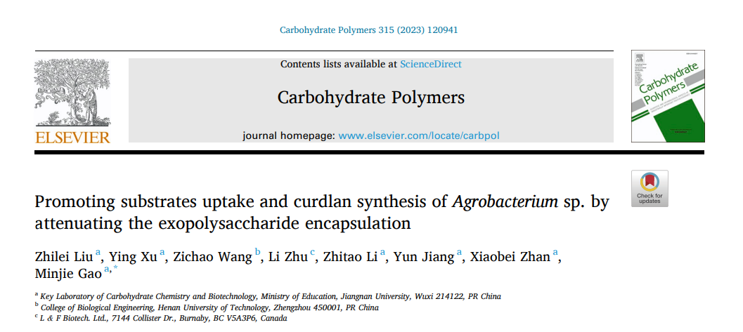 高敏杰教授团队在低分子量热凝胶的高效制备方面取得重要进展,研究成果“Promoting substrates uptake and curdlan synthesis of Agrobacterium sp. by attenuating the exopolysaccharide encapsulation”正式发表于Carbohydrate Polymers (IF = 11.2) (//doi.org/10.1016/j.carbpol.2023.120941)。