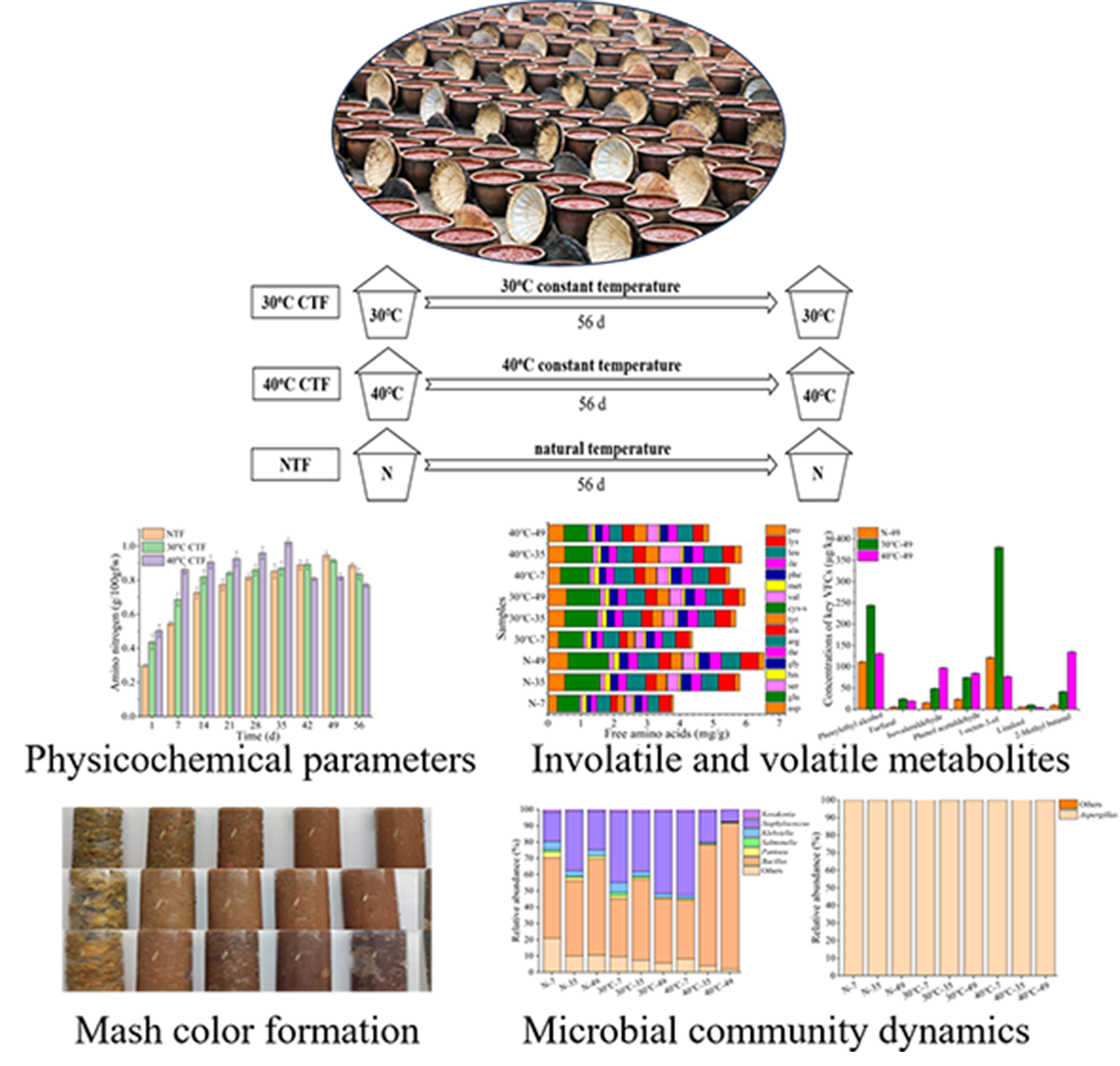 李崎教授团队旨在阐明温度对豆瓣酱发酵的影响,理性设计了豆瓣酱在不同温度条件下的发酵过程,阐明了不同温度条件下豆瓣酱发酵过程中理化指标、风味物质、功能性物质和微生物群落组成的变化规律,发现在豆瓣酱发酵前期采用相对较高的温度可以显著加快氨基酸态氮、还原糖、氨基酸、有机酸和挥发性风味物质的形成,此外,40oC发酵还能抑制食源性致病菌(克雷伯氏菌和沙门氏菌);然而较高的温度同时会显著提升豆瓣酱酱醅中的总酸和生物胺的含量,且由于更激烈的美拉德反应酱醅色泽会偏黑,失去光泽。通过感官品评,发现较高温度发酵得到的豆瓣酱酱香、花香得分较高,但同时具有较强的烘烤味和刺激味道。温度的变化同时显著改变了豆瓣酱微生物群落的组成及其与豆瓣酱品质的关联性。基于上述结果,作者提出采用变温发酵工艺可能更适合豆瓣酱发酵。本研究不仅阐明了豆瓣酱微生物群落响应不同温度的变化情况,同时也为后期豆瓣酱的机械化生产奠定了基础。