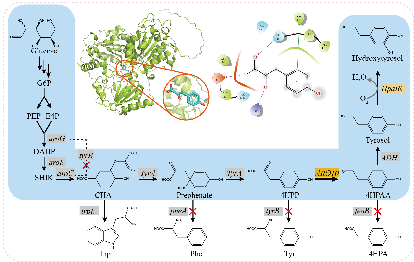 酪醇(2-(4-羟基苯基)乙醇)是一种重要的植物天然产物,由于其在抗氧化和抗炎方面的显著特性,在医药和化工领域被广泛应用。此外,酪醇也是合成高附加值化学品的重要前体,包括羟基酪醇和红景天苷。目前酪醇可以通过植物提取、化学合成和生物合成等多种方法获取。由于微生物合成酪醇及其衍生物是一种绿色、可持续的生产方法,逐渐引起了研究者的广泛关注。
