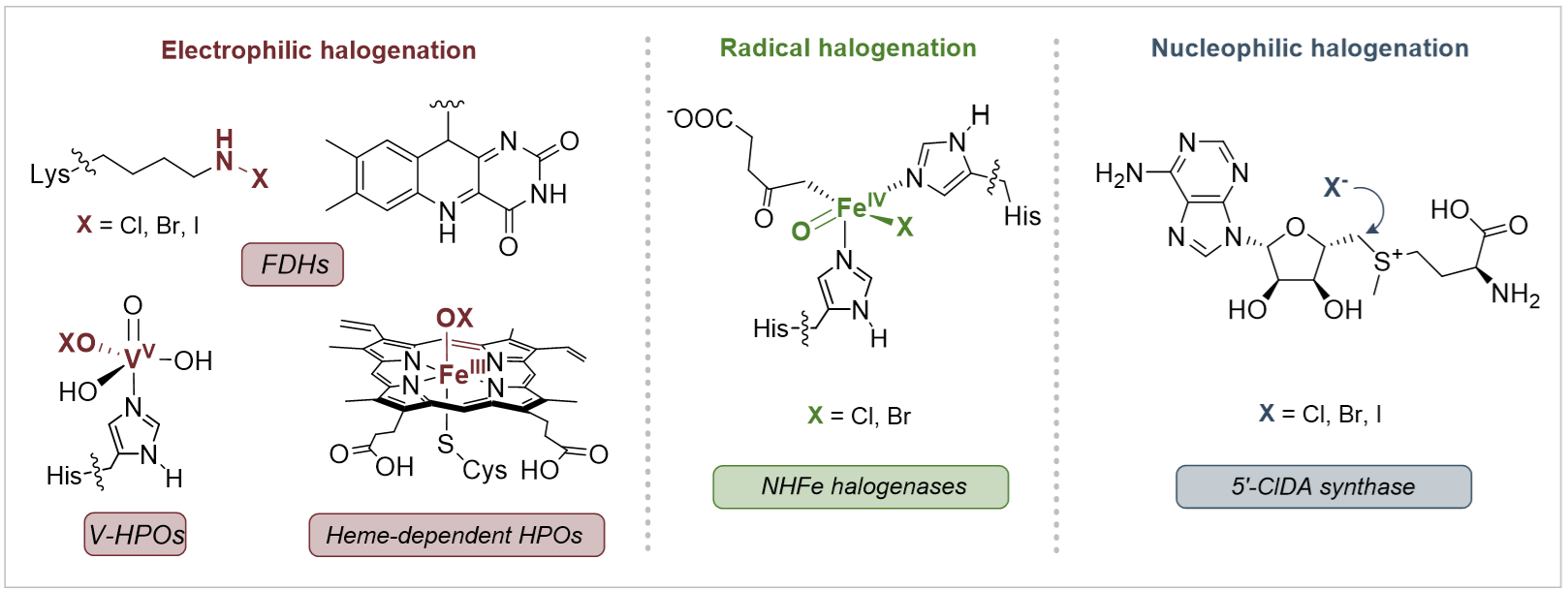 与之相反,自然界中含氟分子的数量却十分有限。到目前为止,人们仅发现约30种天然有机氟化合物,但是同为卤素家族的天然有机氯化合物和有机溴化合物有近2000种已被发现。导致自然界中有机氟化合物稀缺的一个重要原因是酶促碳–氟键形成机制的单一性,目前唯一已知能够在生物合成途径中催化C–F键形成的酶是氟化酶(Fluorinase),它能够催化氟负离子亲核进攻S-腺苷甲硫氨酸(SAM)产生5'-氟脱氧腺苷(5'-FDA)。但是,自然界进化产生的氯化酶和溴化酶可以利用多种反应机制来构建碳–卤键,如:经历次氯酸根中间体的亲电卤代机制、经历铁氧中间体的自由基卤代机制以及亲核卤代机制(图1)。