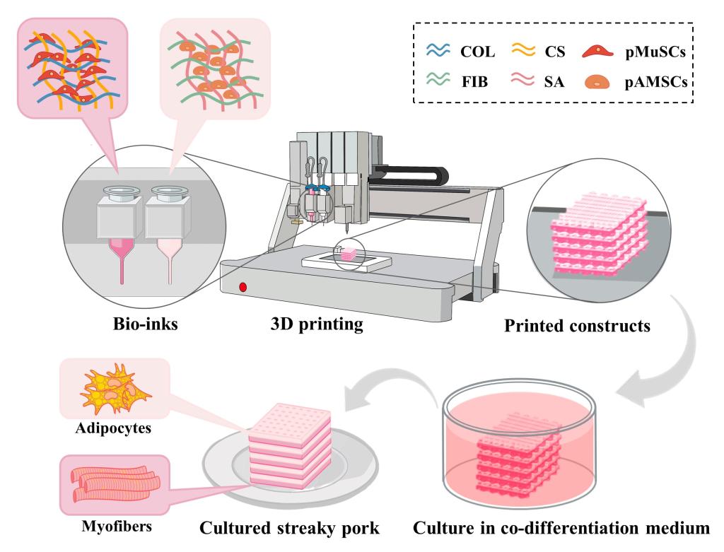 食品合成生物学与生物制造团队研究人员以猪肌肉干细胞(pMuSCs)和猪间充质干细胞(pAMSCs)为研究对象,基于可食用生物材料构筑了适用于两种细胞的双网络水凝胶并将其与细胞组装成生物墨水,创新性地开发了3D 共打印和共分化技术制备出兼具肌肉和脂肪组织的细胞培养五花肉。在之前的工作中,研究人员已经确定了一种有效支持pMuSCs三维增殖和分化的胶原蛋白-壳聚糖复合水凝胶(COL-CS),在本研究中,通过评估pAMSCs在不同水凝胶中的黏附、增殖和分化效率,确定了由纤维蛋白原和海藻酸钠组成的复合水凝胶(FIB-SA)具有最佳效果。随后,用上述2种水凝胶分别包裹pMuSCs和pAMSCs制成生物墨水,通过优化细胞负载量、打印压力和速度,获得了2种生物墨水的最佳打印参数。进一步,研究人员开发了一种共分化策略,实现了pMuSCs分化形成肌纤维和pAMSCs分化形成脂肪的同时诱导。使用该策略,pMuSCs的肌管生成效率与传统方法相当,pAMSCs的脂滴生成面积比传统方法提高了155.5%。最后,研究人员通过两种生物墨水的交错打印构建了五花肉的三维结构,并使用共分化策略诱导肌管和脂肪细胞的同时生成,最终制造出包含肌肉和脂肪组织的细胞培养五花肉。进一步的质构和营养评估表明,细胞培养五花肉具备肉类产品的烹饪特性和食用品质。这项工作为更加灵活、精准、仿生制造含多种组分的细胞培养肉类产品提供了创新策略和技术参考。