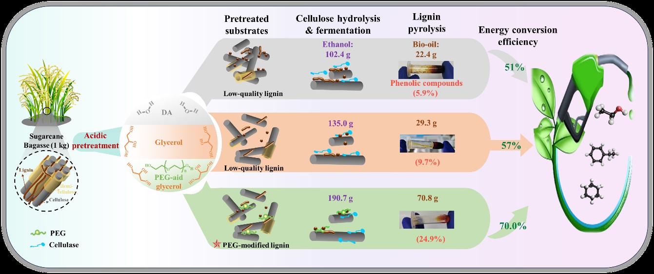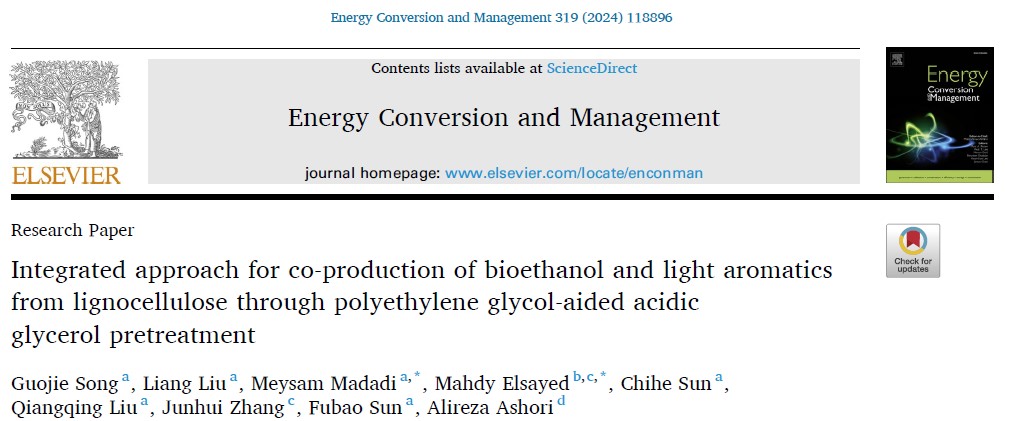 生物资源与生物炼制研究团队在木质纤维素生物质联产生物乙醇和轻质芳烃化合物方面取得重要进展,研究成果“Integrated approach for co-production of bioethanol and light aromatics from lignocellulose through polyethylene glycol-aided acidic glycerol pretreatment”正式发表于Energy Conversion and Management(一区, Top, IF 9.9)。