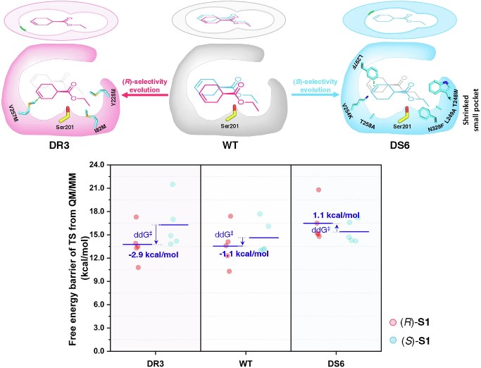 研究团队首先开发了一种高通量方法来生成羧酸酯酶AcEst1的高质量数据集,利用羧酯酶的生化特征包括体积、疏水性、亲水性、静电、氢键、π-π相互作用和到催化残基的距离用于训练ML模型,评估并训练了包括核岭回归(KRR)、高斯过程回归(GPR)、梯度提升回归树(GBRT)、随机森林回归(RFR)、支持向量回归(SVR)和贝叶斯岭回归(BRR)6个回归模型在AcEst1的对映选择性与7个生化特征之间的相关性。将经过训练的ML预测模型应用于设计组合突变体,成功实现了羧酸酯酶AcEst1立体选择性的发散进化,构建了(R)-选择性和(S)-选择性的突变酶DR3和DS6,并在1 M底物浓度下实现(R)和(S)-CHCE的合成与分离,并采用分子动力学(MD)模拟及QM/MM计算解释了羧酯酶及其突变体立体选择性调控的分子机制。