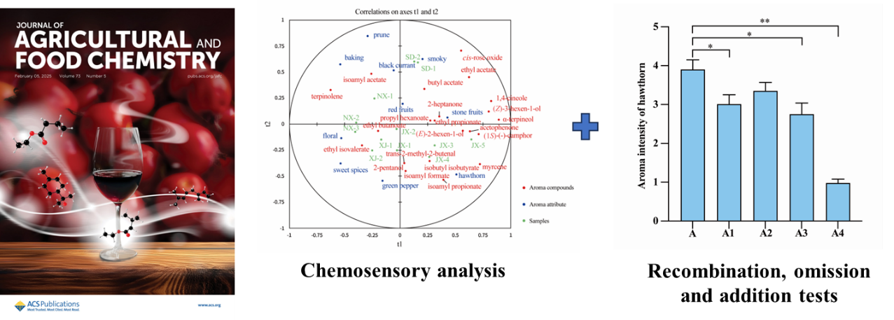 近日,我校生物工程学院徐岩教授团队唐柯副教授在葡萄酒山楂特征风味解析方面取得重要进展,相关研究成果“Characterization of odorants causing the hawthorn aroma in Cabernet Sauvignon wine by gas chromatography-olfactometry, quantitation, aroma recombination, omission and addition studies”以封面文章发表于Journal of Agricultural and Food Chemistry(一区, Top, IF 5.7)(//pubs.acs.org/doi/10.1021/acs.jafc.4c09533)。