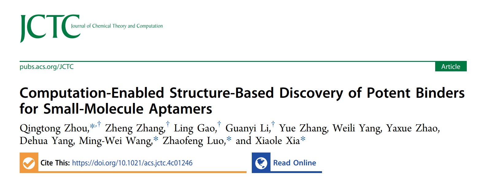 夏小乐教授团队联合复旦大学周庆同教授在核酸适配体的开发和利用研究中取得重要进展,研究结果“Computation-Enabled Structure-Based Discovery of Potent Binders for Small-Molecule Aptamers”正式发表于计算化学领域顶刊《Journal of Chemical Theory and Computation》(一区,IF=5.7)(//doi.org/10.1021/acs.jctc.4c01246)。