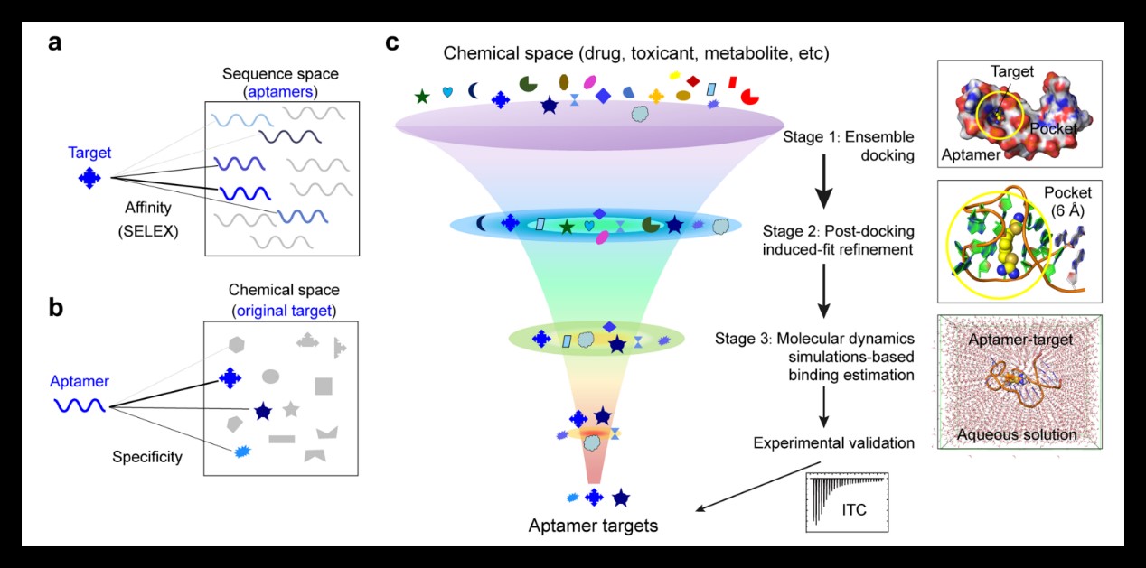 核酸适配体是一小段经体外筛选得到的寡核苷酸序列,能与相应的配体进行高亲和力和强特异性的结合,已经广泛应用于生物传感器、疾病诊断和治疗领域。凭借“化学抗体”(高亲和力/特异性)、体积小和易于生产等优点,许多基于适配体的应用已在实验室中实现。适配体能够与预期靶标(而不是其他化学物质)有效和选择性地相互作用,这对于它们在化学多样化的世界中的应用至关重要。高结合亲和力可增强疗效、稳定性和响应性,而特异性可最大限度地减少脱靶效应和假阳性,使这两个属性在实际应用中至关重要。然而有研究发现适配体的特异性和亲和力是独立的属性,其之间没有相关性,高亲和力不一定能转化为高特异性。传统的实验方法通过施加筛选压力来淘筛高亲和力核酸适配体并使用反向筛选来减少非靶结合以提高特异性。然而,核酸适配体的靶标特异性表征仍仅局限在靶标类似物和实验对照品。在化学空间内系统性地检索核酸适配体的结合剂(即靶标)对揭示核酸适配体的功能多样性和增强靶标特异性具有重要意义,是传统实验方法难以完成的。
