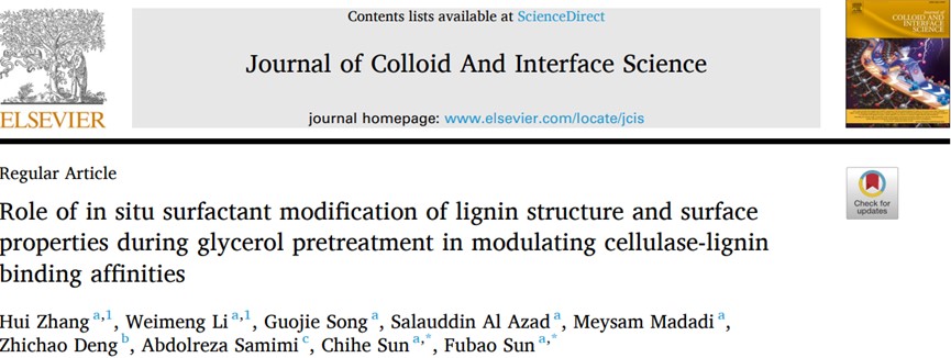 生物资源与生物炼制研究团队在表面活性剂修饰型预处理增效纤维质酶解作用方面取得重要进展,研究成果“Role of in-situ surfactant modification of lignin structure and surface properties during glycerol pretreatment in modulating cellulase-lignin binding affinities”正式发表于Journal of Colloid And Interface Science(一区, Top, IF 9.4)。