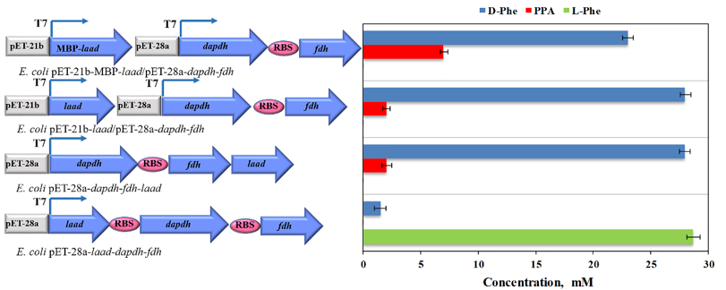 聂尧教授团队将分别来源于Proteus mirabilis的L-氨基酸脱氨酶(LAAD)和来源于Symbiobacterium thermophilum的二氨基庚二酸脱氢酶H227V突变体(DAPDH)及来源于Burkholderia stabilis的甲酸脱氢酶(FDH)构建成一个级联细胞工厂来高选择性合成D-氨基酸。为了构建高效的体内级联系统,该研究评估了三种调节酶表达水平的策略,包括单质粒共表达,双质粒共表达和双质粒MBP融合共表达。通过优化和筛选获得具有高催化效率的双质粒MBP融合共表达菌株大肠杆菌pET-21b-MBP-laad/pET-28a-dapdh-fdh。在最佳条件下,添加15 mM NADP+和300 mM甲酸铵,75 mg/mL的大肠杆菌pET-21b-MBPlaad/pET-28a-dapdh-fdh全细胞生物催化剂催化150 mM L-苯丙氨酸(L-Phe)在24h内高选择性立体异构合成D-苯丙氨酸(D-Phe)(ee > 99%)。另外,该体内级联细胞工厂还可成功用于多种芳香族和脂肪族L-氨基酸高选择性立体异构合成相应的D-氨基酸。本研究设计构建多酶耦联的立体异构体内级联细胞工厂并实现D-氨基酸及其衍生物的高选择性合成,为高效廉价的绿色生物制造D-氨基酸类化合物提供新的思路和方法。