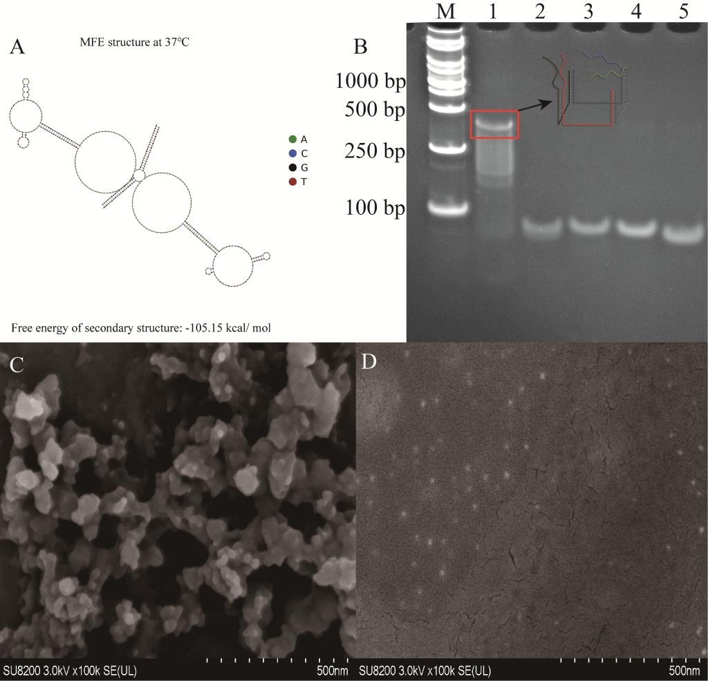 图二. (A)DNA六面体形成序列的结构模拟图,(B)DNA六面体形成序列和结构框架的电泳图,(C)沉积了聚苯胺和(D)未沉积聚苯胺的DNA六面体的扫描电镜图