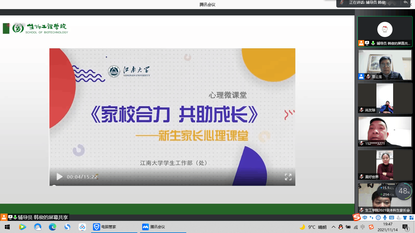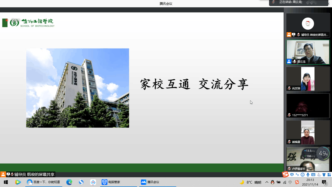 校情校史。接着,周云龙聚焦学院历史沿革与学科底蕴,围绕学院师资队伍、科学研究、文化传承与创新等方面,从学院近年来毕业生升学和就业去向分享了学院人才培养成效。最后,周云龙从重视学生心理健康教育出发,与家长们分享了学生发展的宝贵经验:引导树立积极乐观的心态;学会感恩和宽容;提高直面挫折的勇气;教会孩子学会自我保护,提高安全意识;鼓励孩子敢于梦想;培养孩子良好的沟通技巧与合作能力;引导形成正确的钱财观;帮助学生正确认识自我,塑造完整人格,实现全面发展。最后,学院新生辅导员韩俊就学校疫情防控举措、学业课程安排和学生管理服务三个方面,传达了学院师生高度重视新生转型教育的理念与举措,向家长们介绍了同学们近期的状态和学院特色活动,让家长放心。同时对家长们提出三点建议:希望家长们关注学生在校状态,与孩子交流;肯定学生在校独立生活和适应集体生活的能力;提高防诈骗的安全意识,及时实现家校沟通。