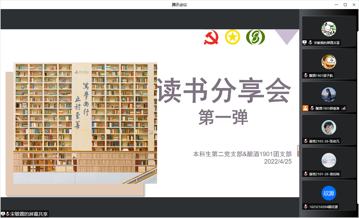 本科生第二党支部、酿酒1901班“赤水河”特称团支部联合举办了“书海遨游拾贝”读书分享会。来自党支部和团支部的5名同学依次分享了推荐书籍,100余名同学聆听分享。在思想碰撞中,大家的视野得以打开,收获颇丰。