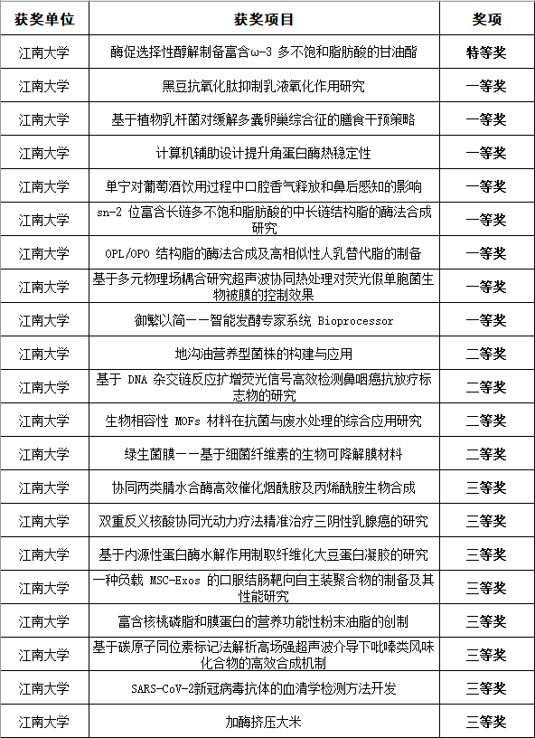 本届大赛受疫情影响,全程采用网络方式完成。经过材料初审和复赛,我校9个学生项目入围决赛。经过激烈角逐,食品学院李才明、王小三老师指导,陈烨等同学参赛的《酶促选择性醇解制备富含ω-3多不饱和脂肪酸的甘油酯》斩获特等奖。食品学院郑召君、徐勇将老师指导,艾子璇等同学参赛的《黑豆抗氧化肽抑制乳液氧化作用研究》,食品学院王刚老师指导,石刘婷等同学参赛的《基于植物乳杆菌对缓解多囊卵巢综合征的膳食干预策略》,生命科学与健康工程学院龚劲松、苏畅老师指导,江佳宇等同学参赛的《计算机辅助设计提升角蛋白酶热稳定性》,欧美无码 唐柯老师指导,师戈图等同学参赛的《单宁对葡萄酒饮用过程中口腔香气释放和鼻后感知的影响》,食品学院邹孝强、黄健花老师指导,李亚茹等同学参赛的《sn-2位富含长链多不饱和脂肪酸的中长链结构脂的酶法合成研究》,食品学院王小三老师指导,赵昕辰等同学参赛的《OPL/OPO结构脂的酶法合成及高相似性人乳替代脂的制备》,食品学院姚卫蓉、于航老师指导,姜琳等同学参赛的《基于多元物理场耦合研究超声波协同热处理对荧光假单胞菌生物被膜的控制效果》,欧美无码 张玲、杨海麟老师指导,张一冉等同学参赛的《御繁以简——智能发酵专家系统Bioprocessor》均荣获一等奖。