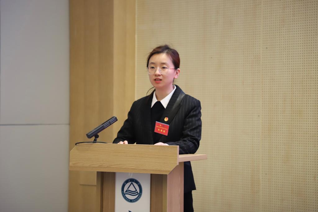 程捷音代表学院党委作主题为《不忘初心,勇毅前行,在矢志奋进中谱写青春之歌》的讲话。她指出,团委紧跟时代步伐,坚持以习近平新时代中国特色社会主义思想为指导,以一流学科发展方向为指引,发扬“善于实践,勇于创新”的发酵精神,勤奋求实、锐意进取,在基层团建、思想引领、校园文化、社会实践、志愿服务等各方面取得了优异成绩。最后也对全院青年提出三点希望:第一,坚定“不忘初心跟党走”的信念,勇做民族复兴的先锋队;第二,树立“打铁还需自身硬”的自觉,争做改革创新的生力军;第三,培养“自古英雄出少年”的气魄,敢做创造未来的弄潮儿。