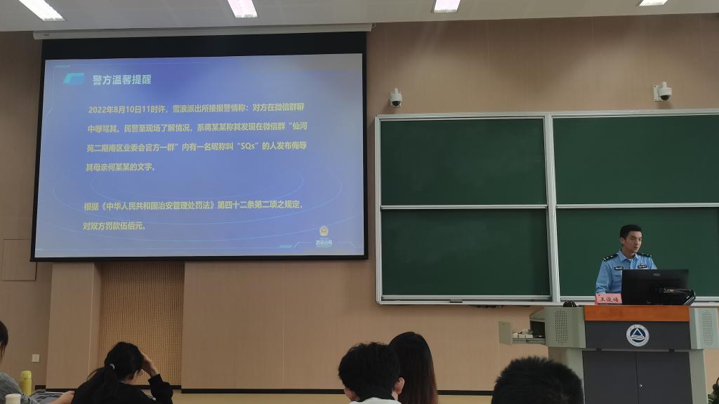在二教2A127举办研究生新生安全教育讲座。无锡市公安局滨湖分局雪浪派出所王俊皓警官带来了《防范诈骗专题讲座之走进高校》主题报告。学院辅导员张同舟和2023级研究生新生参加活动。