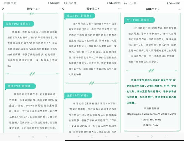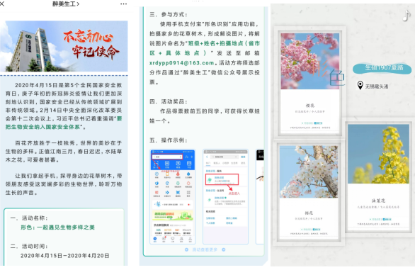 江南三月,春日迟迟,学院发起“我们‘疫’起加‘邮’——春天里的明信片”线上活动,征集同学们的手工作品、温情笔记、水彩绘画、摄影作品制成电子明信片,在官方微信公众号上把同学们的心声、鼓励、信念传递给陌生的朋友。4月15日是第5个全民国家安全教育日,习近平总书记着重强调“要把生物安全纳入国家安全体系”。学院以“形色:一起遇见生物多样之美”线上活动为途径,带领学生利用时新的“形色识别”APP探寻身边的花草树木,感受斑斓多彩的生物世界,聆听万物生长的声音。在第25个世界读书日之际,学院组织“相‘阅’春天里,战疫不孤‘读’”网络活动,分享《爱的艺术》《积极情绪的力量》等专业心理书籍,并鼓励青年大学生充分利用居家时间,坚持每日经典阅读,精读一本书、静读一本书,从书中汲取向上能量、滋养浩然之气,携手成为智慧学习、专业成长共同体。