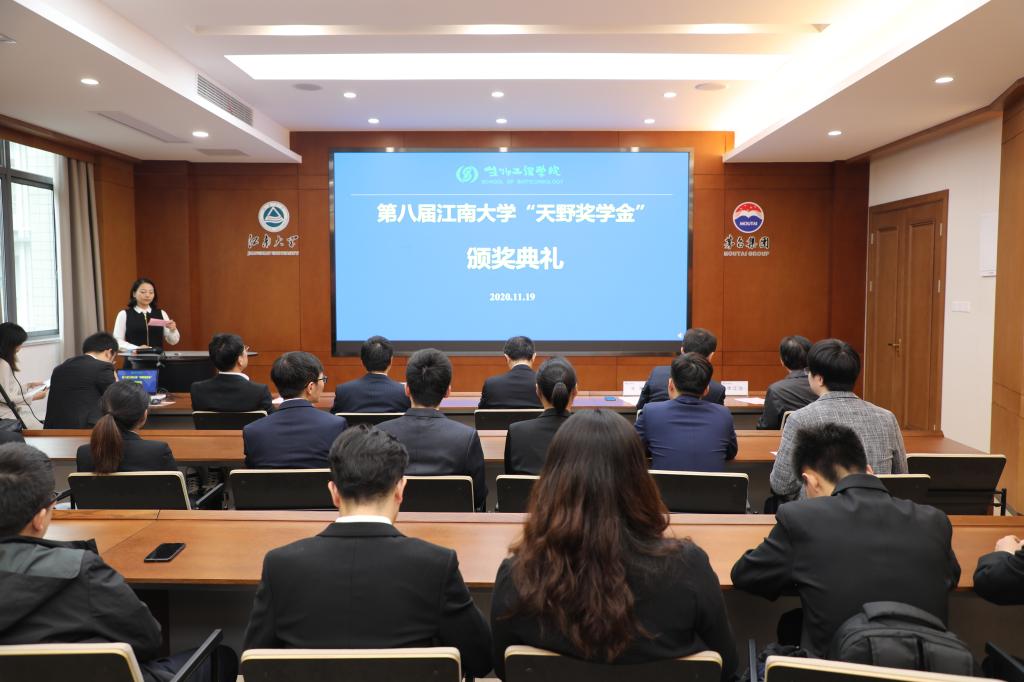 堵国成宣读2020年度天野奖学金获奖名单。颁奖仪式后,获奖学生代表武耀康表达了对天野公司,学院和学校的感激之情。他从自身科研经历出发,总结出勤思考、多实践、常坚守的科研经验,并表示将会继续刻苦学习,发扬生工精神,在未来的道路上不断求索,勇立时代潮头。