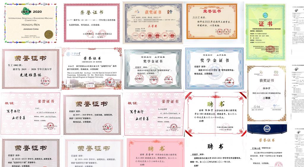 在专业学习上,俩人将掌握的专业知识灵活运用于课题实验中。任泓宇在本科三年参与多项科研竞赛并获得多项荣誉。大一学年荣获第十六届“挑战杯”全国大学生课外学术科技作品竞赛三等奖,大二学年荣获2020年国际遗传工程机器大赛(iGEM)国际金奖。大三学年成功申请国家级大学生创新项目并顺利结题,同时参与发表3篇论文(两篇SCI),获得国家发明专利2项。石金田在作为队长参加“第五届生命科学创新创业大赛(2020)”荣获二等奖,担任课题组长,申请专利2篇,作为队长参加“挑战杯”等国家级竞赛并获奖。
