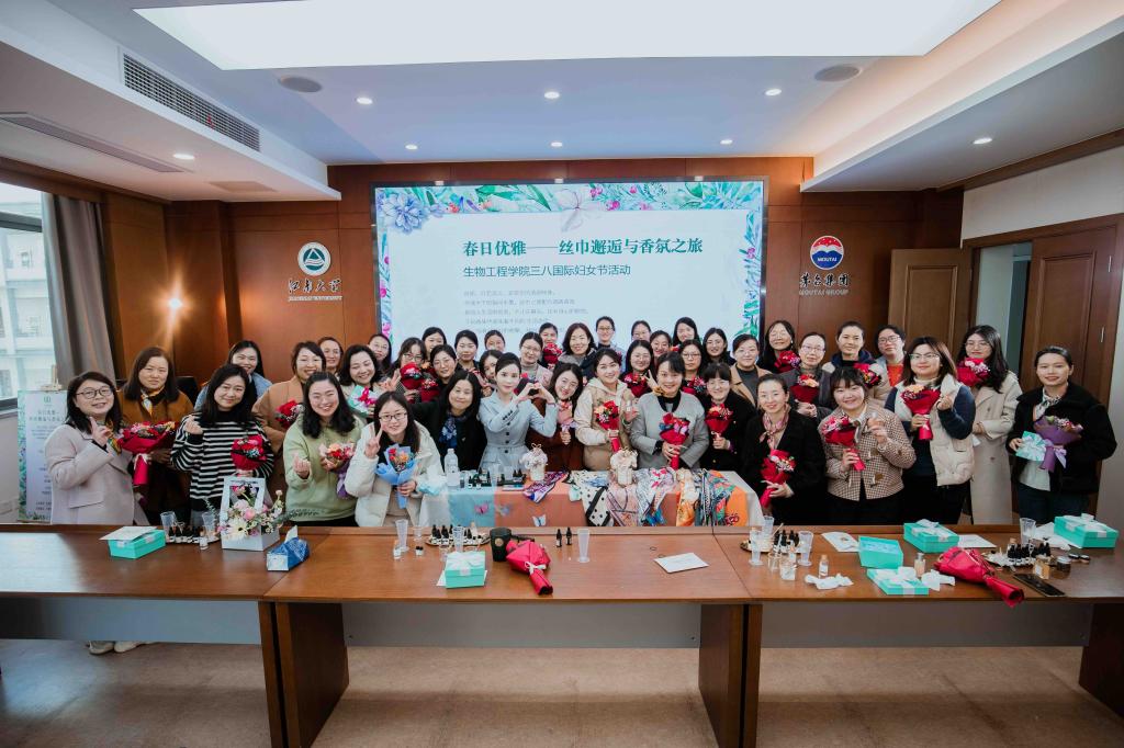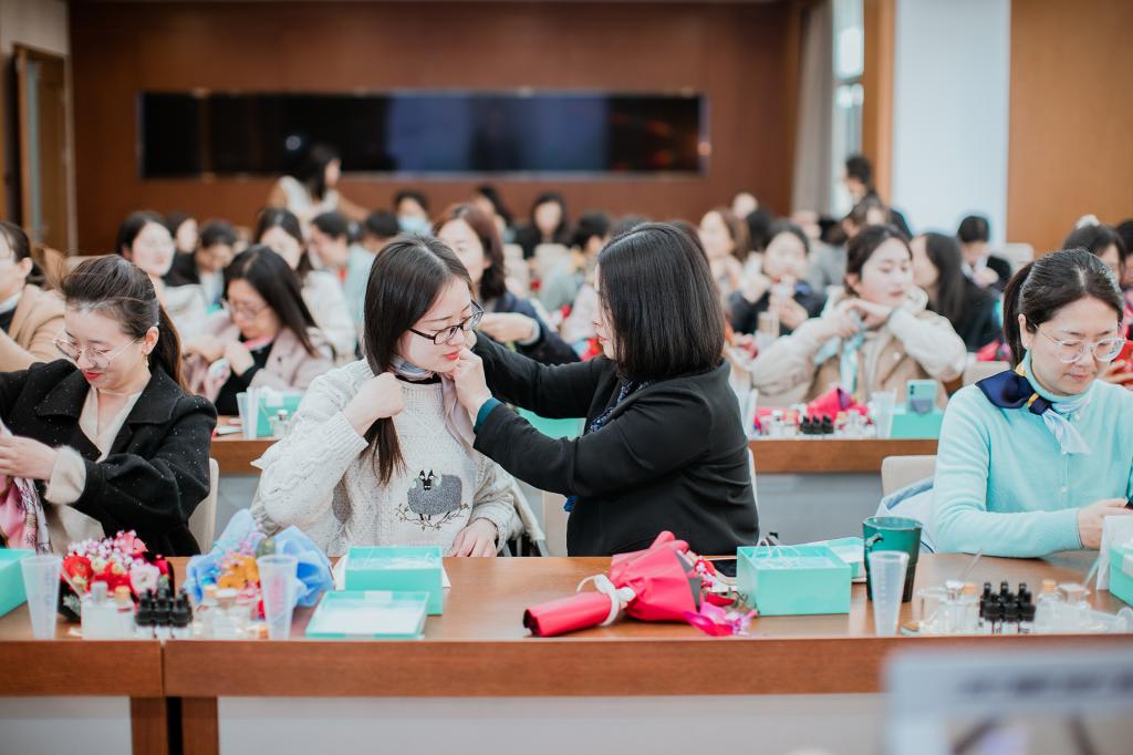 丝质,形若流云,是莫奈的清晨印象,抑或大千的指间水墨。丝巾之旅配合沉浸式调香香氛,是专属的柔情和浪漫,是闯入生活的惊喜,更是美丽的生活态度。参加丝巾美学与香氛邂逅的陆老师幸福洋溢地说:“感受到学院满满的关怀,愿女同胞们温馨随你奔跑,美丽挂在容颜,健康常伴身边,幸福常驻心田,节日快乐!”现场座无虚席,在主持人带领下,老师们学系丝巾,调制香氛,欢声笑语,其乐融融。
