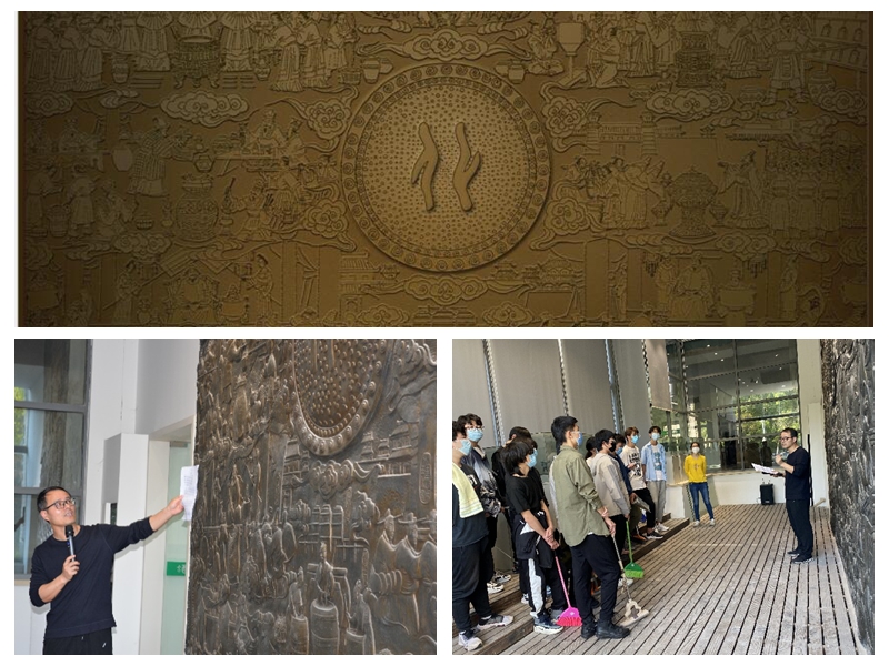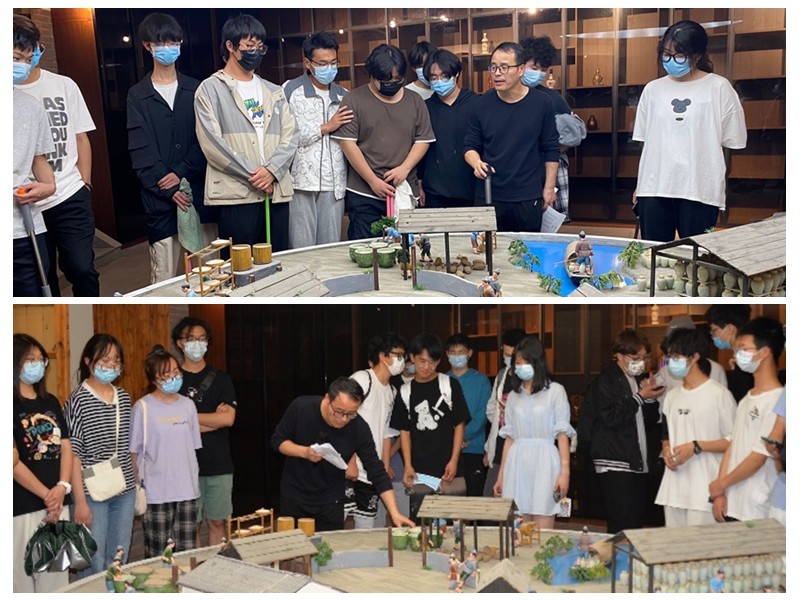 进入酒科技馆后,映入眼帘的是镌刻着关于中国从古至今酿酒发展历史的“镇馆之宝”——铜雕墙。这个高3米、宽5米的铜雕墙,蕴含着24个酒文化故事,串联起中国酒文化从原始工艺到现代科技的全程转变。大家饶有兴趣地听郑老师解读铜雕的秘密,感悟古人智慧文明的延续。在酒科技馆内部,郑老师展示了果酒生产设备,并提供了用这套设备蒸馏出的果酒供同学们品评。更值得一提的是,在酒科技馆的地窖摆放着展现古代酿酒工艺流程的沙盘。用陶土工艺作品来重现酿酒工艺的流程,为古法酿制工艺增添了更加浓厚的历史氛围,平添了一份艺术气息。精致小巧的沙盘给同学们留下了深刻的印象,听过郑老师的讲解后,大家更是对酿酒这一工艺产生了浓厚的兴趣。