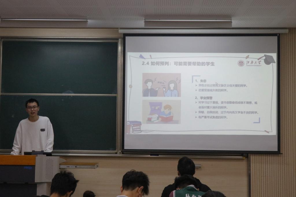 2024级优秀心理主题班会组织者魏巍结合自身实践经验,做“如何开展高质量心理班会”主题分享,同时还根据“心理团体拓展”的类型与心理学依据讲述了在活动中如何通过团队协作、实现自我成长与突破,为后续心理委员开展此类活动提供了系统指导与参考。学院朋辈心理互助协会培训部部长张为峰以“小家长”“知心人”“安全员” 三个角色定位入手做朋辈心理工作技巧培训,梳理讲解常见异常信号识别、沟通化解技巧及突发上报流程,助力学生干部筑牢心理防线,守护“小家庭”安宁。