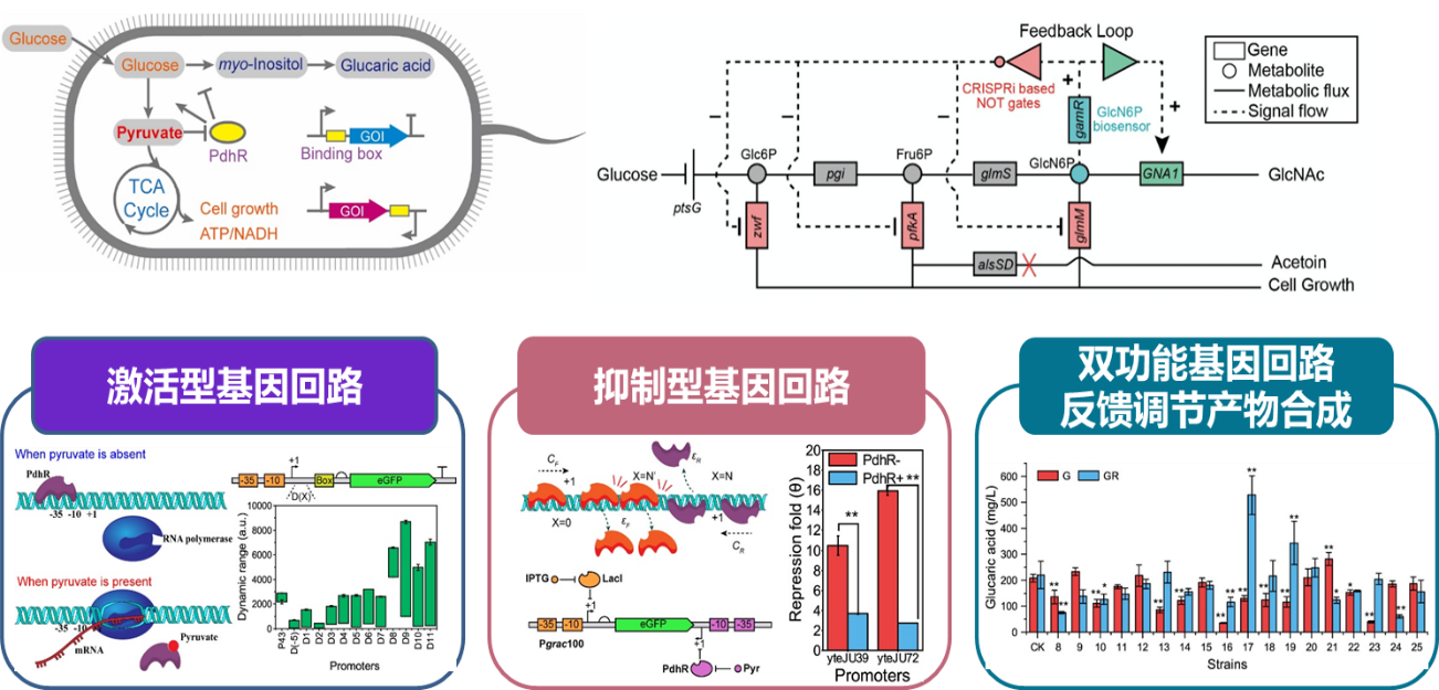 如何实现微生物中心代谢网络代谢流的最优分配一直是高版本微生物底盘细胞构建的研究热点之一。基因回路目前被广泛应用于代谢网络的动态控制,其可以有效避免有毒中间代谢物的积累,平衡细胞生长与产物合成的代谢流,从而提高产物的合成效率。这些基因回路大多通过响应外界环境信号、中间代谢物和信号分子发挥功能。然而,目前缺乏能够响应胞内关键中心代谢物的基因回路,例如丙酮酸。丙酮酸是连接细胞糖酵解途径与三羧酸循环的关键中心代谢物,其一方面为产物的合成提供碳骨架,另一方面进入三羧酸循环为细胞生长提供能量与还原力。因此,构建响应胞内丙酮酸浓度的基因回路能够实现碳中心代谢流的动态控制,促进中心代谢衍生产物的高效合成。