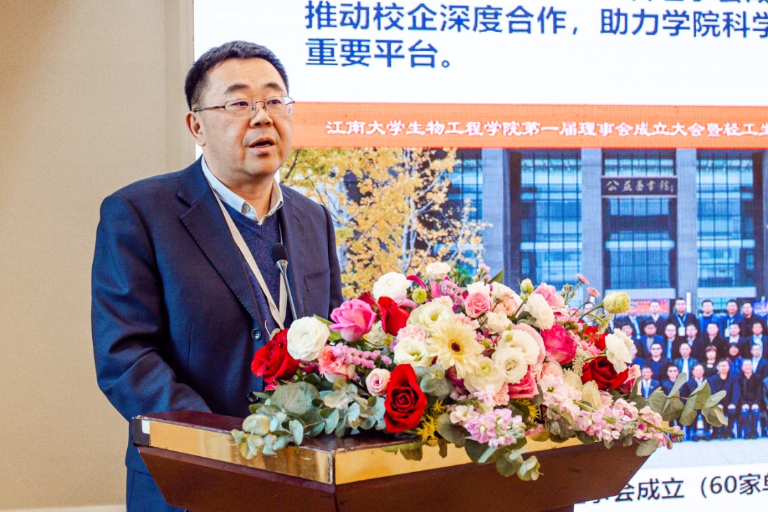 理事会名誉理事长、中国工程院院士陈坚致辞。他肯定了第一届理事会运行发展以来的成绩和贡献,并对理事单位表示感谢。他指出,生物技术和产业正在迅速发展,以“合成生物学”为代表的生物技术正在重塑世界。持续技术创新,抢占世界科技前沿至关重要。在新的时代背景下,他希望学院与理事单位开展更全面和深层次的合作,大学要多做“发现”的工作,实现“从无到有”。企业要做好“发展”的工作,助推“从有到好”。大学的课题要从企业中来,成果要回到企业中去,实现合作的“点加深、线拉长、面拓宽”,把科学论文写在祖国大地上。