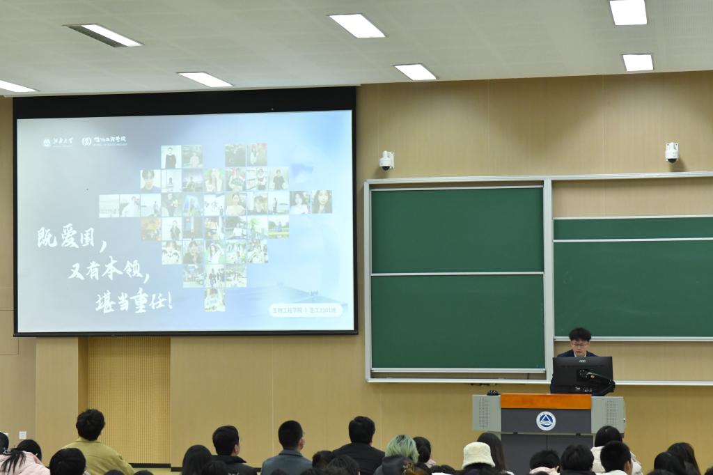 2023-2024学年先进(文明)班集体标兵代表陶孟瑞分享了生工2101班集体的奋进历程。他将班集体的成长比作蛋白质合成,以“汇聚-串联”“交织-辐射”“凝结-生华”三个阶段生动形象地展示了班级在大一、大二和大三阶段的积累收获。从相遇到相识,生工2101全体同学齐心协力,取得了班级成员学年平均绩点3.12、班级累计奖学金17万、科创竞赛100%覆盖、省级社会实践团队等优秀成绩与荣誉。