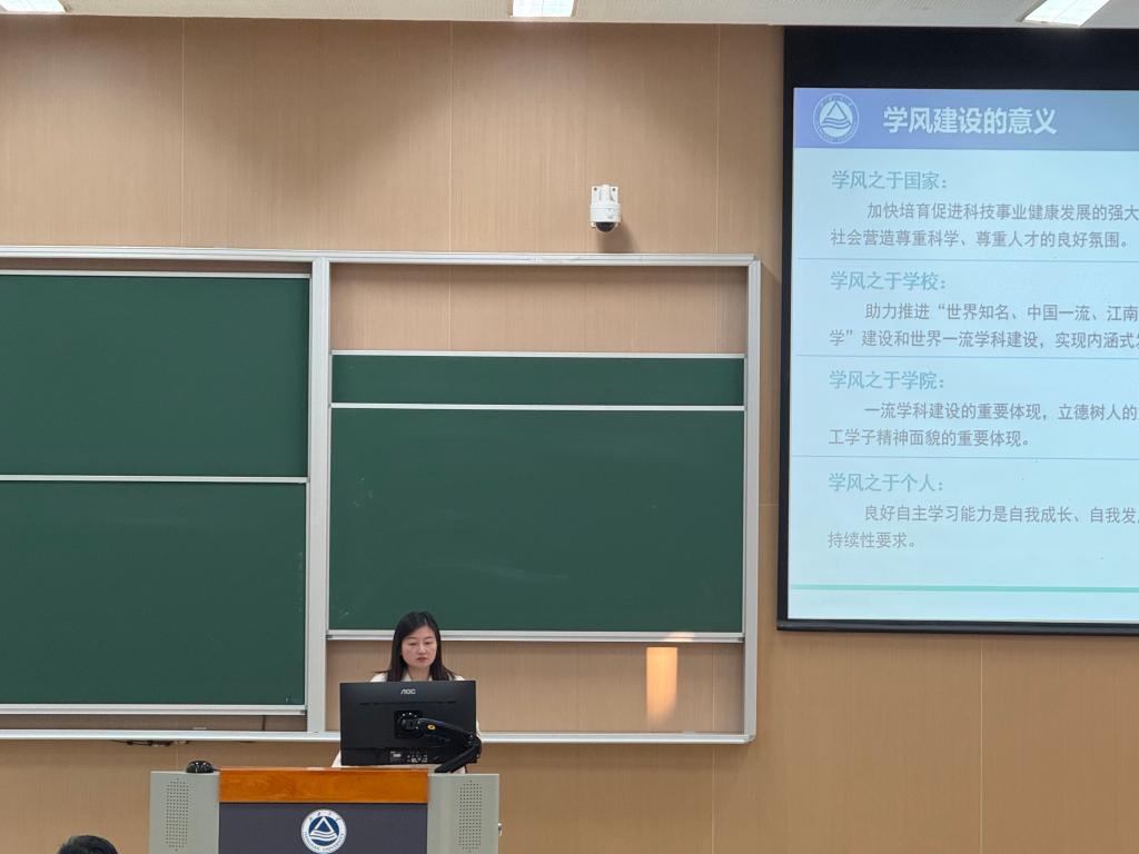 2024年学风建设情况,从工作体系、学风成果、学风创新、数据分析和诚信考试五个方面强调学风建设对于国家、社会、学校以及学生四个层面的重要意义。她指出学院以学生为本,立足学科特色,围绕“建设一流学风,培育一流人才”目标,持续优化教育教学理念,奋力实现优良学风建设和一流人才培养同频共振。与此同时,她围绕近两年学业课程挂科率以及在读本科生英语等级考试通过情况等做了详细数据分析,并结合期末考试强调了考风考纪重要性,通过罗列作弊处分真实案例,以案示警,以案育人,号召生工学子诚信考试、诚信做人。