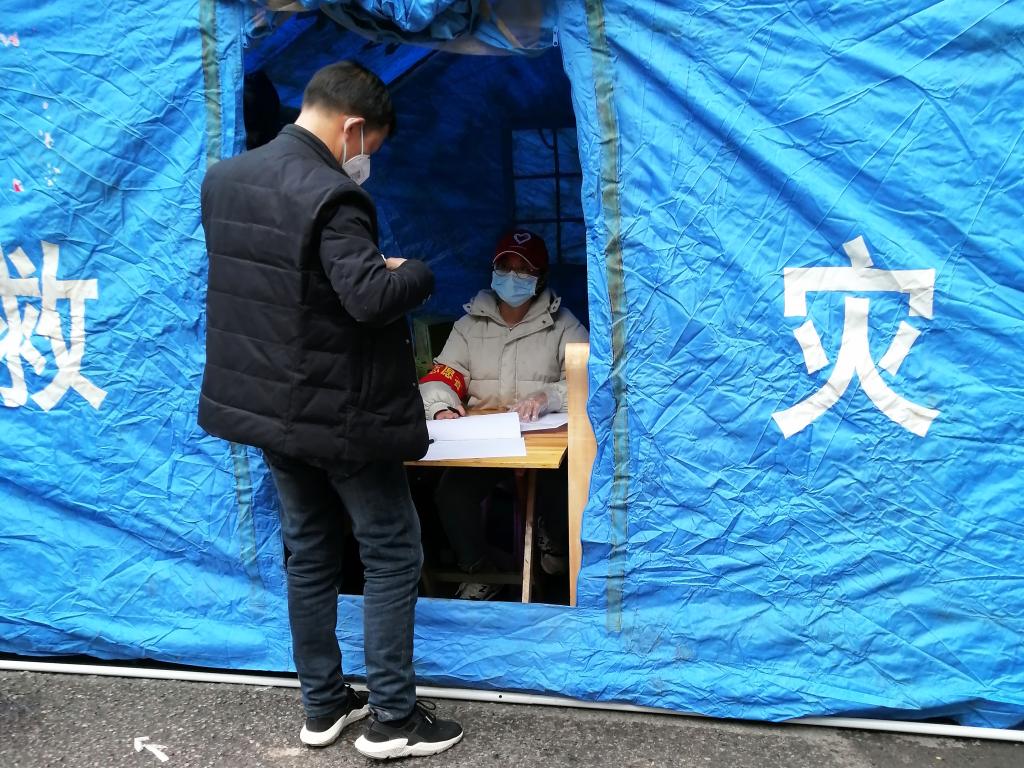 赵天一(右二)向社区住户拨打电话登记住户信息