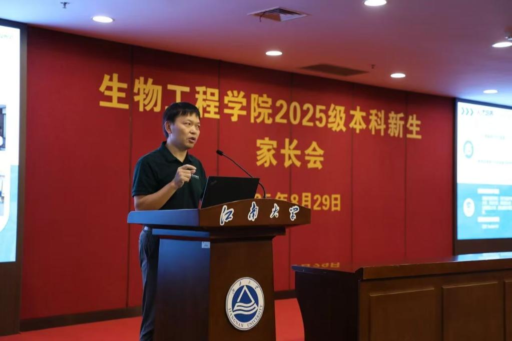 党委书记程捷音,党委副书记、副院长林丹,副院长陈献忠,新生班主任及辅导员共同参会。会议由学院分团委书记周春江主持。陈献忠从学院历史、学科优势与人才培养模式三个方面,向家长展现生工学院的雄厚实力。林丹从大学生心理发展规律出发,分享“家校共育”的理念与方法。最后,程捷音通过“感谢与欢迎 ”“放心与理解”“学习与成长”三组关键词进行了总结分享,并期待家校合力,共同助力学生健康成长。互动环节,家长踊跃提问,围绕专业发展、就业前景、校园生活等话题与老师深入交流。
