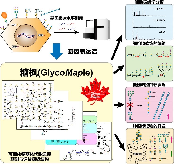 藤田教授课题组挖掘糖基转移酶和糖基水解酶等关键蛋白的细胞表达水平和糖链结构之间的关联,开发基于细胞基因表达水平,可视化糖基化代谢途径和预测细胞糖链结构的系统工具——糖枫(GlycoMaple)。该研究利用细胞基因表达数据预测人体细胞内合成糖链结构的潜力,构建糖基化代谢途径可视化网络工具并应用于细胞糖链结构的预测研究。在模式细胞人类肾胚细胞(HEK293)中预测结果高度拟合,成功预测细胞内的糖链结构。另外该研究利用CRISPR/Cas9技术,构建模式细胞N-糖链缺陷细胞库。通过结合多种传统检测手段,发现N-糖链结构的转变影响了细胞内糖核苷酸的成分,进一步影响了包括糖脂、透明质酸在内的多种糖型代谢的现象,并在基因层面对这以调控做出解释。在器官之间基因表达水平的研究中,揭示细胞分化导致组织器官特异性的糖链差异的原因。在对结肠癌患者细胞对比健康细胞的预测分析中,初步解释在癌症等疾病中普遍发现的糖代谢变化。这项研究证明了糖链预测体系在人类不同细胞,不同器官中都具有广泛的预测能力。